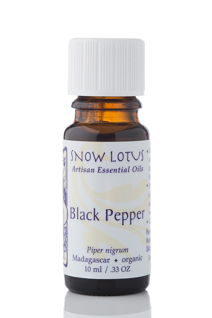 Piper nigrum. Cultivated and certified organic. A typical fresh-spicy fragrance with woody-rooty undernotes. Stimulating, warming, invigorating. 10 ml bottle.