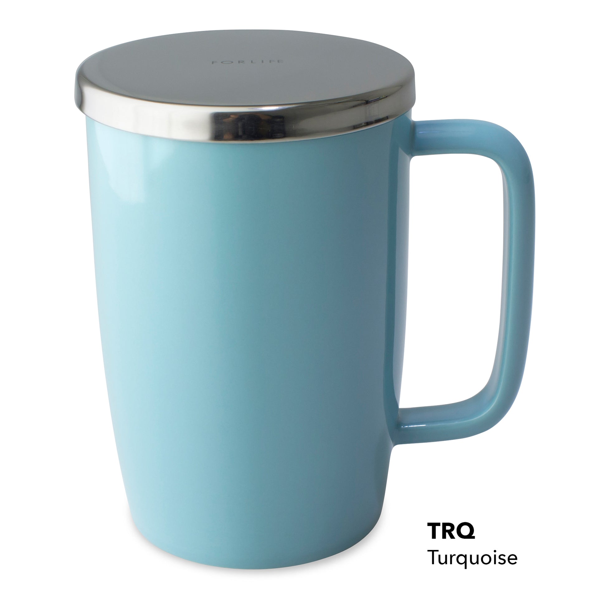 The stainless steel lid serves as an infuser holder. 18 oz ceramic mug with stainless steel basket infuser, and stainless steel lid.