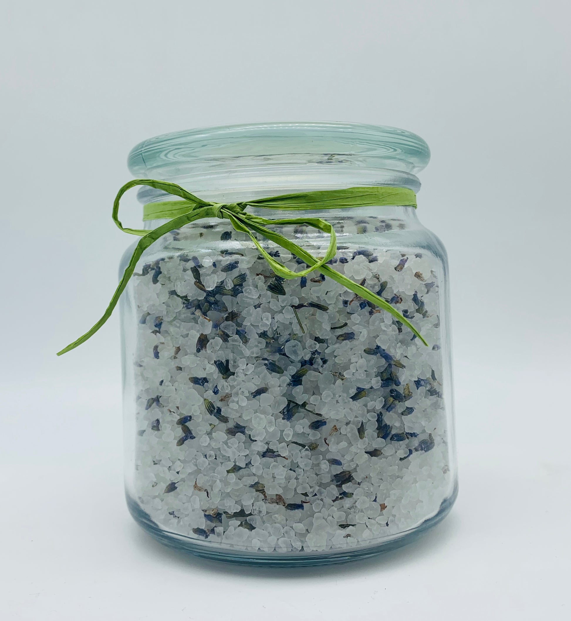 Dead Sea Salts are mixed with Organic Lavender and Spruce essential oils to create a fresh, earthy, and grounding scent to melt away muscle soreness, tension, and stress. Mineralizing dead sea salts soften and strengthen skin, while gently detoxifying. 16 oz glass studio jar. A dead sea salt bath with aromatherapy oils and lavender flowers.